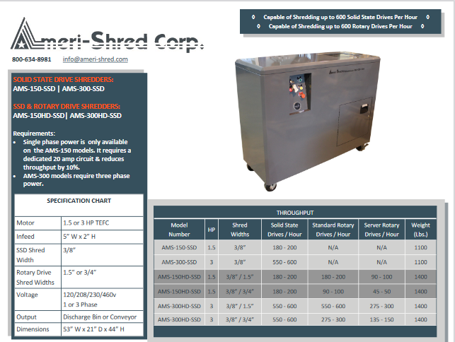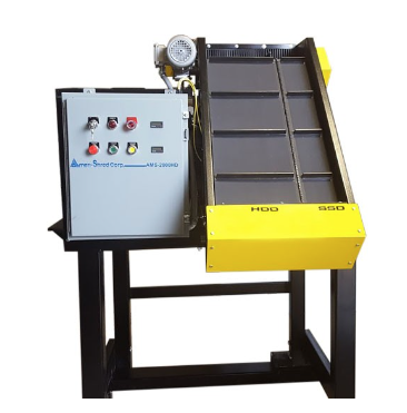 At GreenTek Solutions, we use high-performance shredders from Ameri Shred Corp, specifically the AMS-150HD-SSD and AMS-2000HD-SSD models. This advanced equipment allows us to efficiently crush rotary and solid-state hard drives, backup tapes, DVDs, cell phones, tablets, and several types of electronic waste. The shredders feature a double-head cutting chamber for separate destruction of solid-state drives and platter hard drives.
